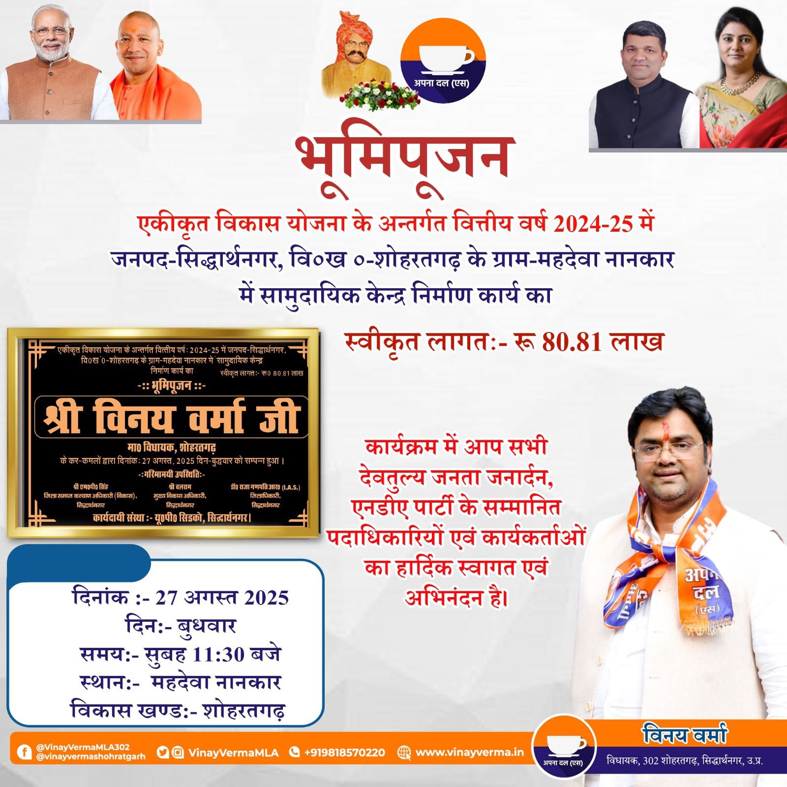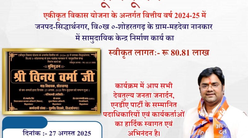 शोहरतगढ़, (सिदार्थनगर): शोहरतगढ़ क्षेत्र में विकास कार्यों को गति देते हुए विधायक विनय वर्मा ने बुधवार को महदेवा नानकार गांव में 80.81 लाख रुपये की लागत से बनने वाले सामुदायिक केंद्र का भूमिपूजन किया। यह सामुदायिक केंद्र एकीकृत विकास योजना के अंतर्गत वित्तीय वर्ष 2024-25 में बनाया जाएगा।